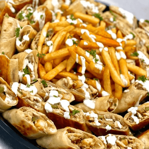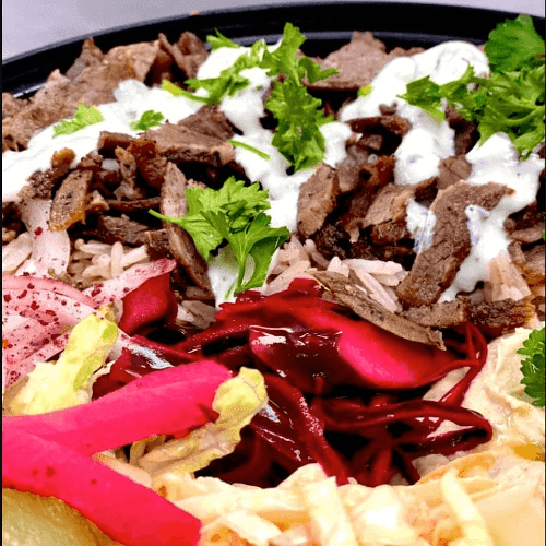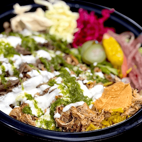A generous portion of tender, spiced lamb atop a bed of fluffy basmati rice. Served with classic hummus, spicy hummus, coleslaw, red cabbage salad, fresh lettuce, tomato, sumac onions, Middle Eastern pickles, and pepperoncini. Drizzled with creamy white sauce and zesty green sauce, creating a perfect balance of savory, tangy, and fresh flavors in every bite.