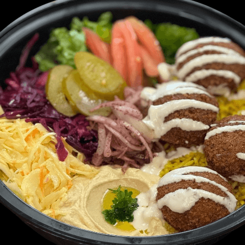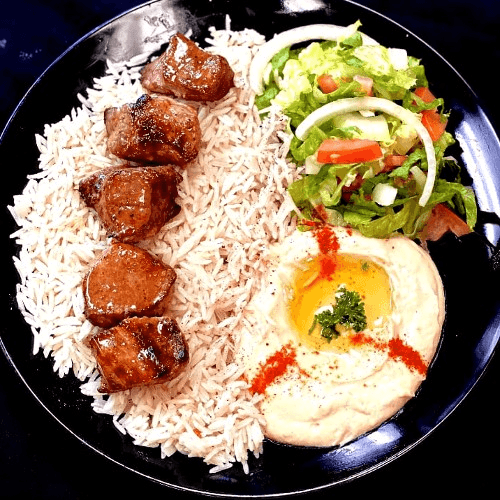 Enjoy the best of both worlds with tender, spiced lamb and perfectly grilled chicken atop a bed of fluffy basmati rice. Served with classic hummus, spicy hummus, coleslaw, red cabbage salad, fresh lettuce, tomato, sumac onions, Middle Eastern pickles, and pepperoncini. Drizzled with creamy white sauce and tangy green sauce for a perfect balance of flavors in every bite.