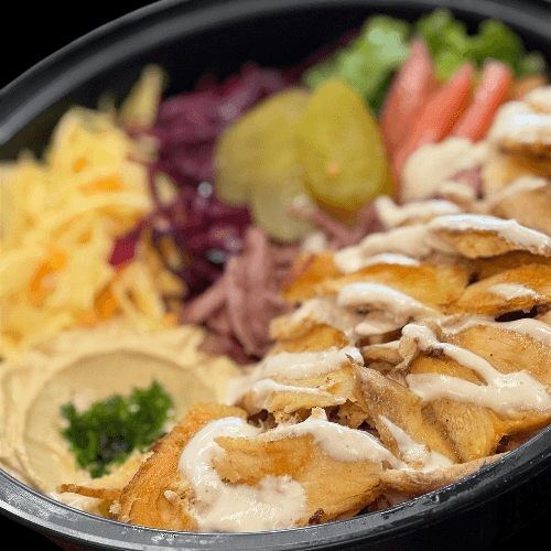 A generous portion of perfectly seasoned, grilled chicken atop a bed of fluffy basmati rice. Paired with classic hummus, spicy hummus, coleslaw, red cabbage salad, fresh lettuce, tomato, sumac onions, Middle Eastern pickles, and pepperoncini. Finished with a drizzle of creamy white sauce and tangy green sauce, offering a harmonious blend of savory, fresh, and zesty flavors.
