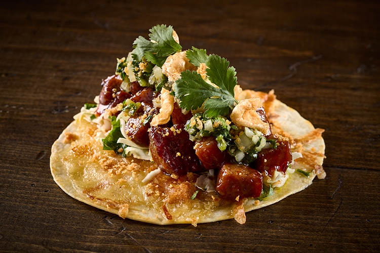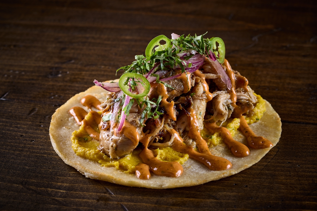 Chipotle Guava BBQ Carnitas, Garlic Lime Mojo, Onion, Swiss Cheese, Slaw, Flour Tortilla.