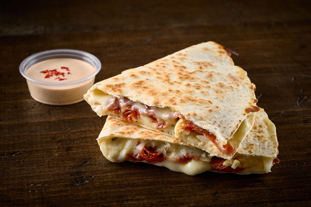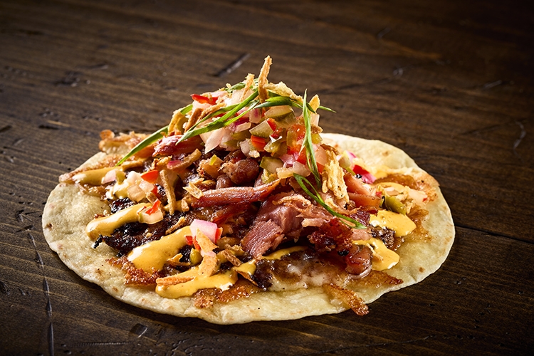 Smashburger, Cheddar, Chopped Pickles, Shredded Bacon, White BBQ, Crispy Onion, Flour Tortilla.