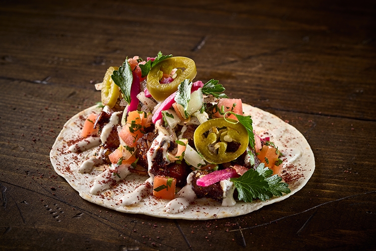 Brisket Shawarma, Tahini Crema, Parsley, Jalapeño, Tomato, Pickled Turnip, Sumac Onion, Flour Tortilla.