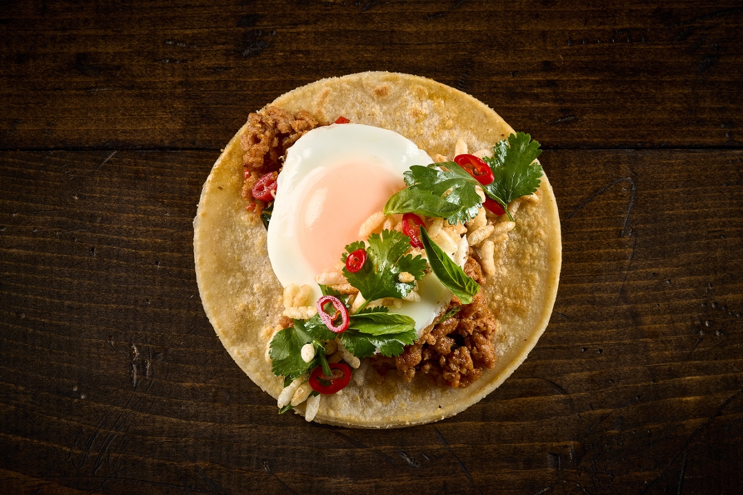 Chicken Chorizo, Crispy Rice Salad, Thai Basil, Cilantro, Chiles, Fried Egg*.