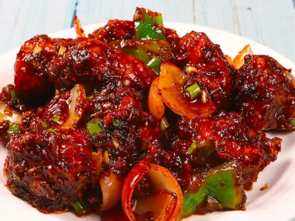 Chicken cubes marinated with ginger & garlic, sauteed with onion, curry leaves, and chili sauce