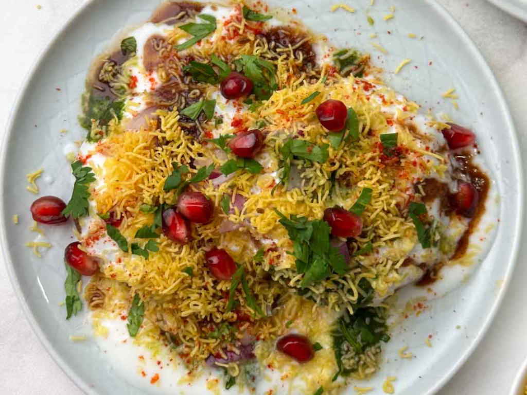 Flour crisps mixed with boiled potatoes, onions, tomatoes, and chickpeas, topped with yogurt and chutneys.